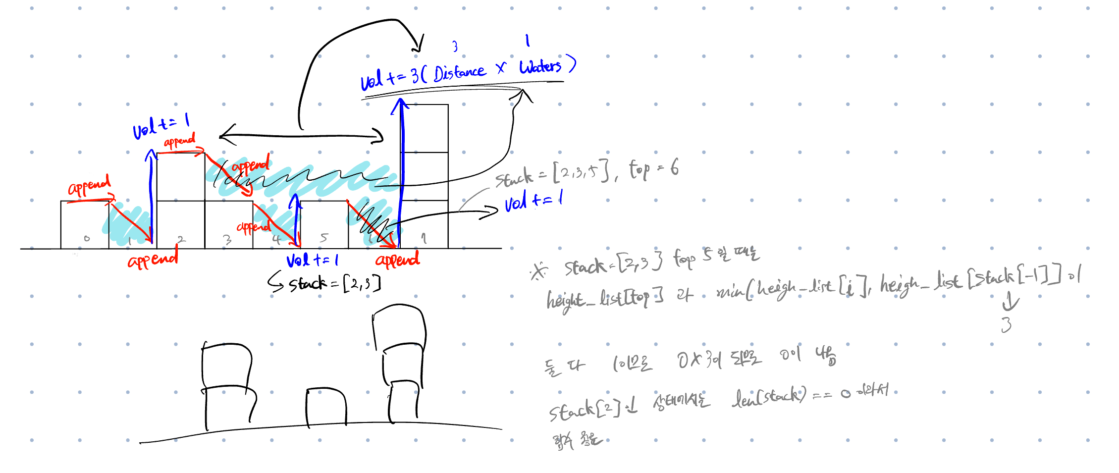 max_left와 max_right이 있고 현재의 값이 min(max_right, max_left)보다 작으면 사잇값으로 치는거고 현재의 값을 min(max_left, max_right)에다가 빼면서 왼쪽 현재값이 오른쪽 현재값과 같아지면 함수가 종료되는 로직이다.