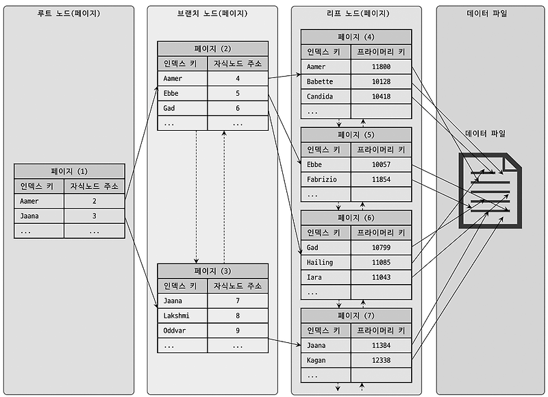 - 루트 노드에서부터 비교를 시작해 브랜치 노드를 거치고 최종적으로 리프 노드까지 찾아 들어가야만 비로서 필요한 레코드의 시작 지점을 찾을 수 있다.