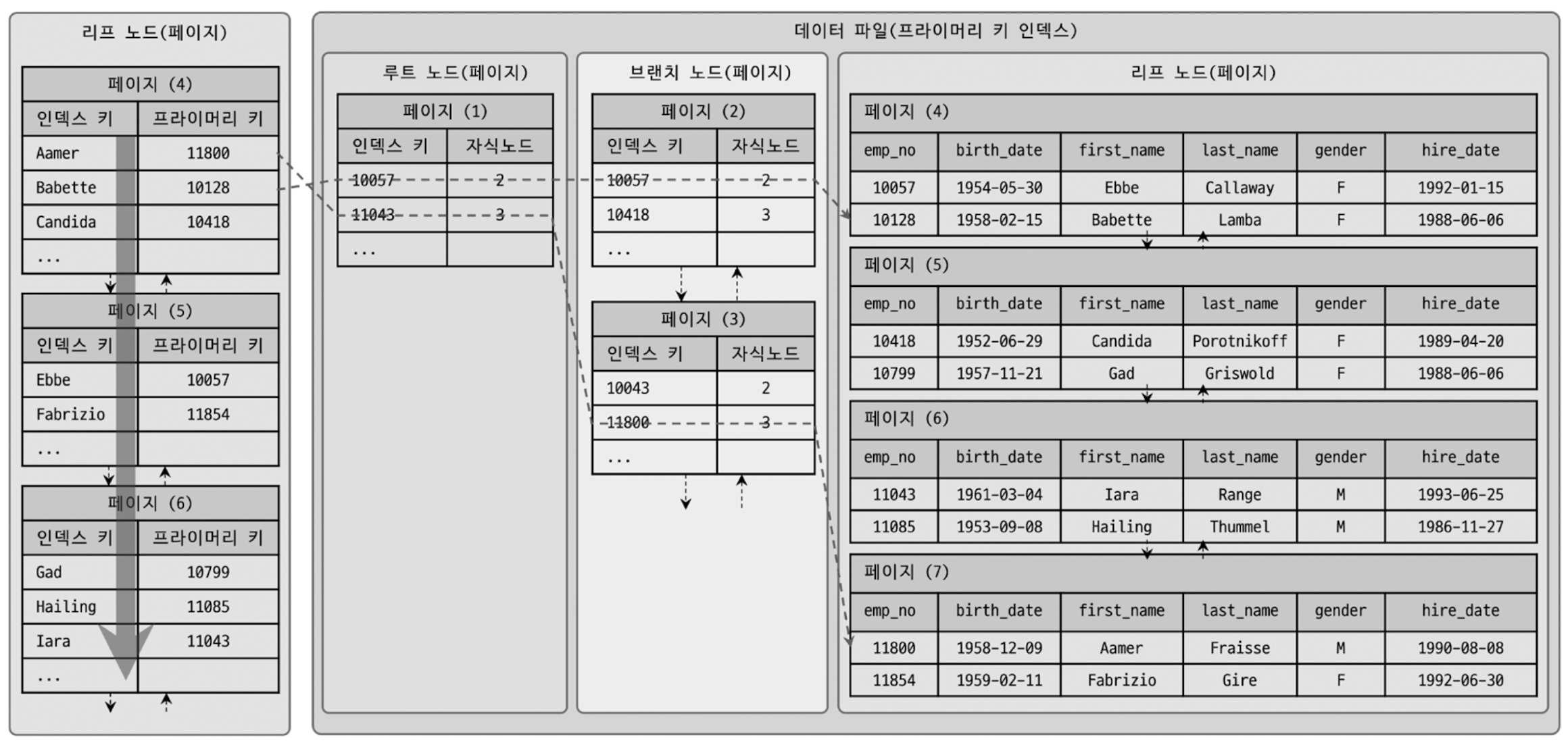 - InnoDB는 인덱스에 저장돼 있는 프라이머리 키 값을 이용해 프라이머리 키 인덱스를 한 번 더 검색한 후, 프라이머리 키 인덱스의 리프 페이지에 저장돼 있는 레코드를 읽는다.