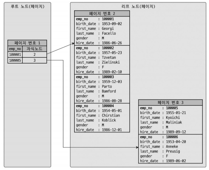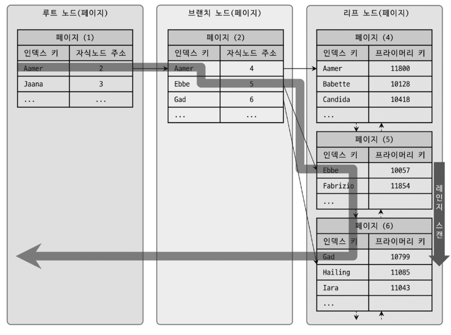- 일단 시작해야 할 위치를 찾으면 그때부터는 리프 도느의 레코드만 순서대로 읽으면 된다.