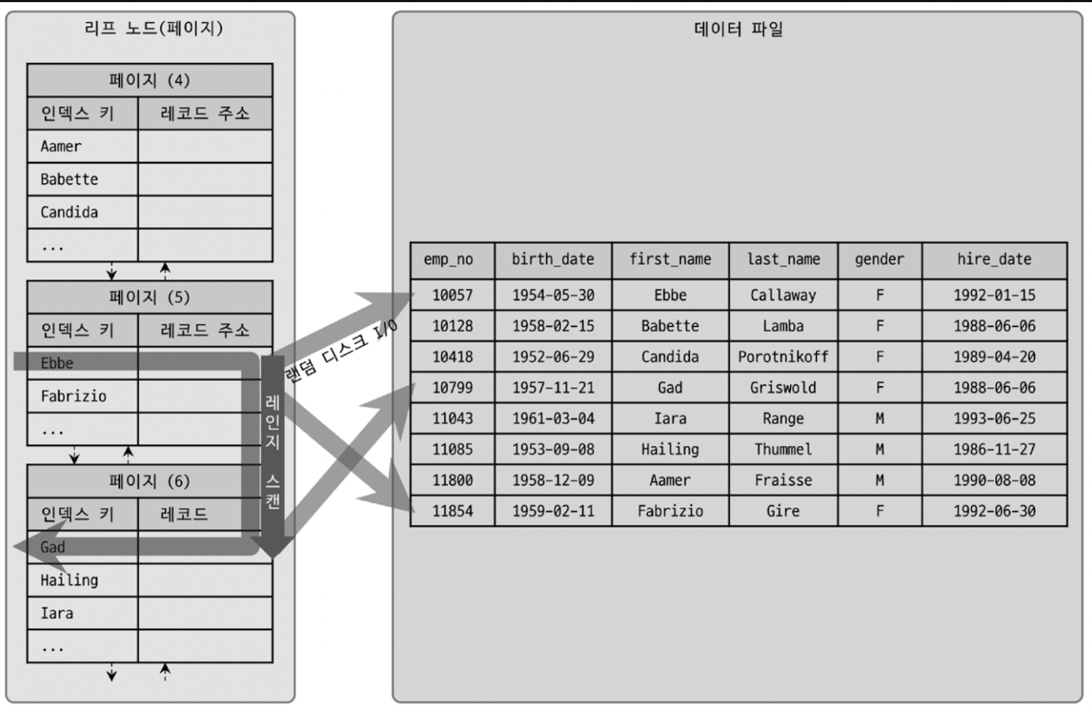 인덱스 레인지 스캔은 데이터를 읽기 위해 주로 랜덤 IO를 사용하며, 풀 테이블 스캔은 순차 IO를 사용한다. 그래서 큰 테이블의 레코드 대부분을 읽는 작업에서는 인덱스를 사용하지 않고 풀 테이블 스캔을 사용하도록 유도할 때도 있다. 이는 순차 IO가 랜덤 IO보다 훨씬 많은 레코드를 읽어올 수 있기 때문인데, 이런 형태는 OLTP(On-Line Transaction Processing) 성격의 웹 서비스보다는 데이터 웨어하우스나 통계 작업에서 주로 사용된다.