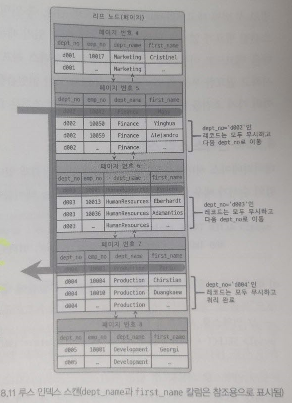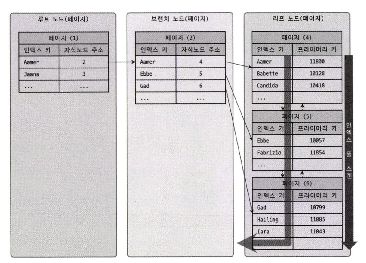 - 먼저 인덱스 리프 노드의 제일 앞 또는 제일 뒤로 이동한 후, 인덱스의 리프 노드를 연결하는 링크드 리스트를 따라서 처음부터 끝까지 스캔하는 방식을 의미한다.