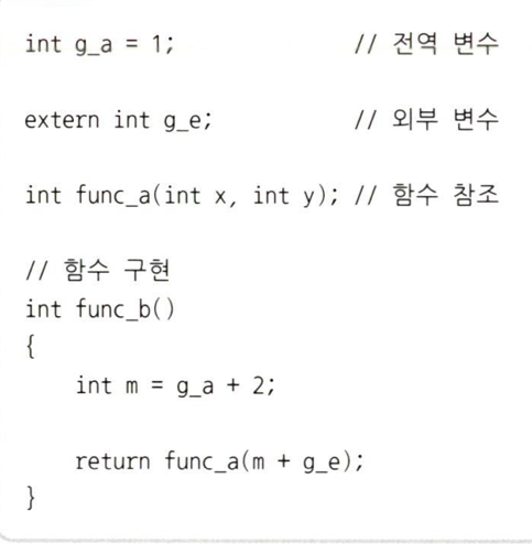 - 다른 모듈에서 정의한 심벌 두 개(외부 변수 g_e, 외부 함수 func_a)를 참조한다.