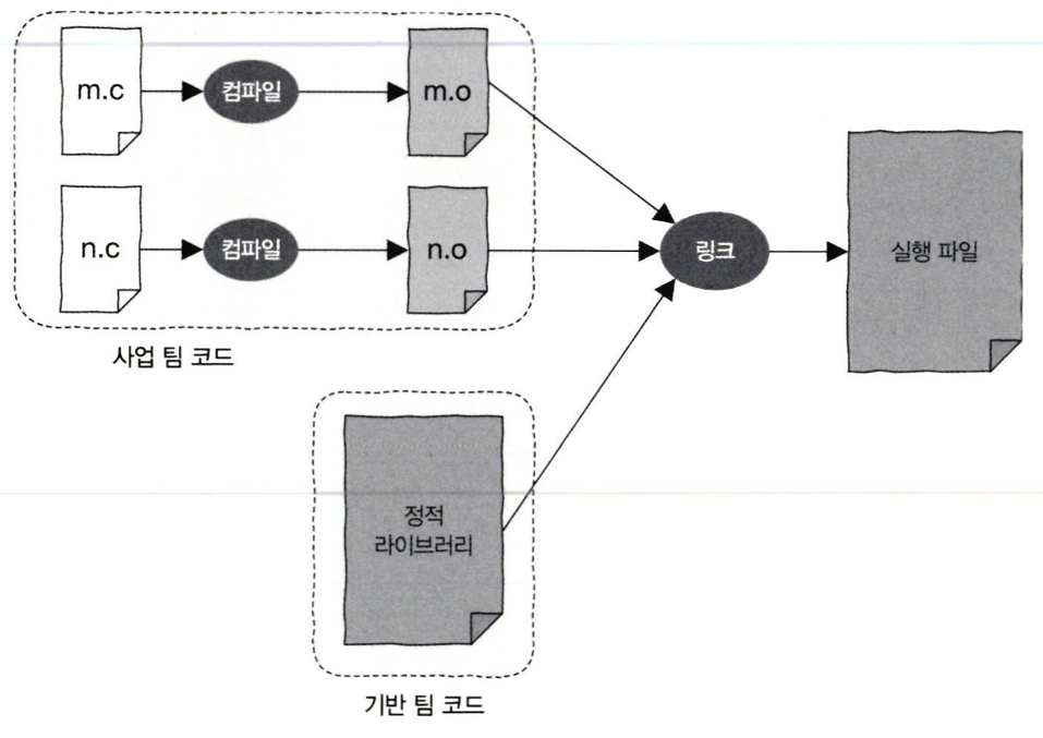 - 실행 파일을 생성할 때 자신의 코드만 컴파일하며, 미리 컴파일이 완료된 정적 라이브러리는 다시 컴파일할 필요 없이 링크 과정에서 그대로 실행 파일에 복제한다. - 정적 링크 (static linking)