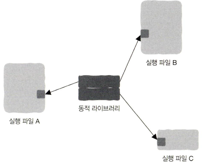 - 정적 라이브러리와 달리 참조된 동적 라이브러리 이름, 심벌 테이블, 재배치 정보 등 필수 정보만 실행 파일에 포함한다.