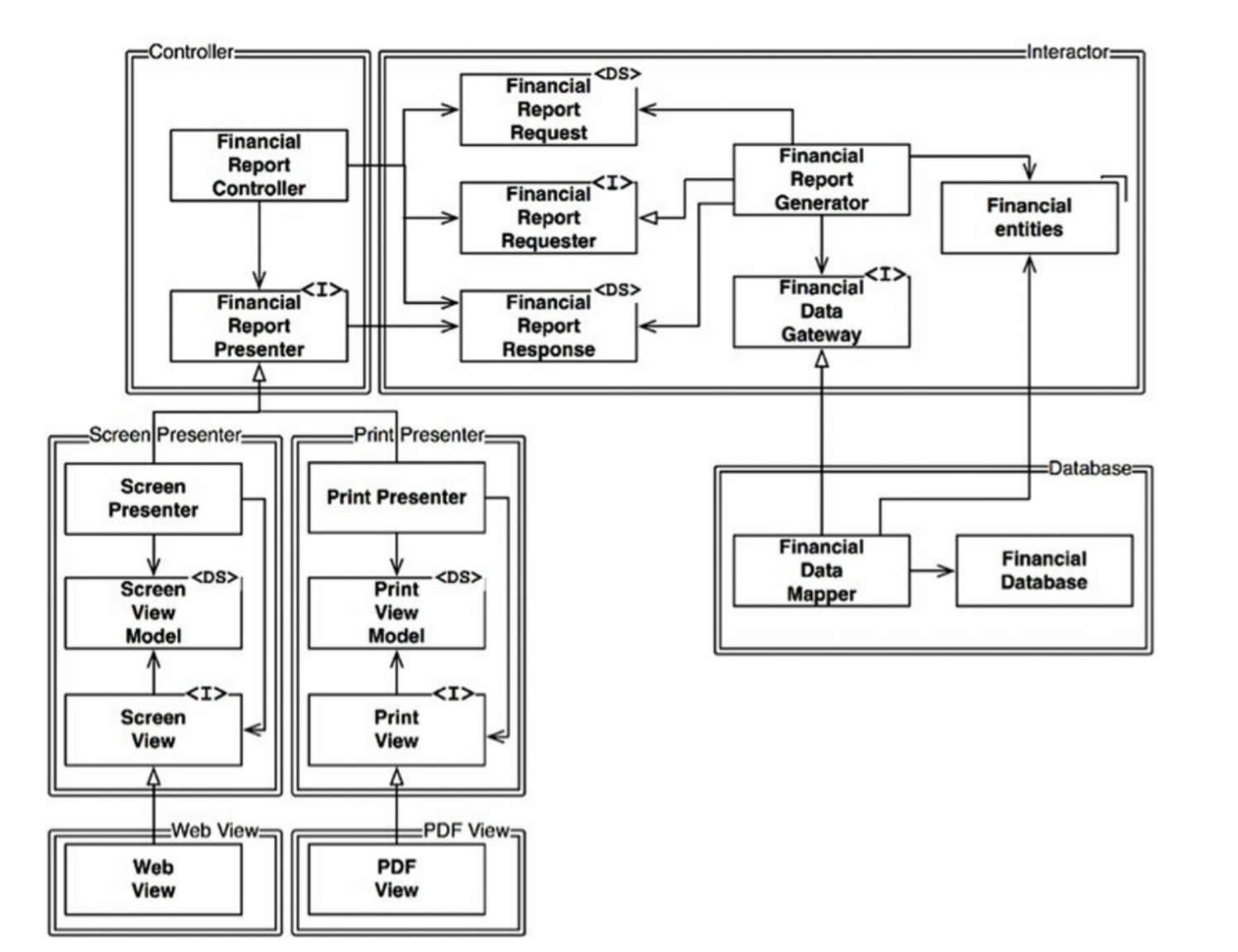 위의 사진에서 대표적인 예시로 FinancialDataGateway 인터페이스는 FinancialReportGenerator와 FinancialDataMapper 사이에 위치하는데, 이는 의존성을 역전시키기 위해서다. 만약에 FInancialDataGateway가 없다면 의존성이 Interactor 컴포넌트에서 Database 컴포넌트로 향하게 된다.