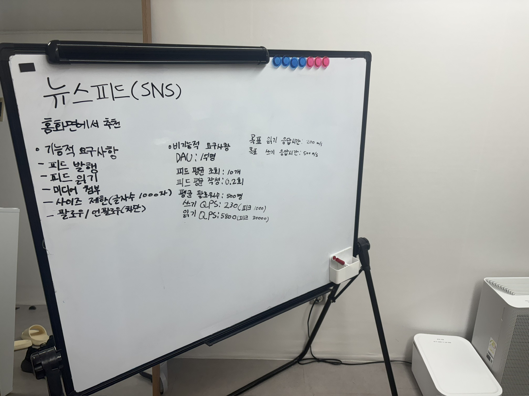 저희는 DAU 1억 명 규모의 글로벌 SNS 뉴스 피드 시스템을 설계하게 되었습니다. 기능적 요구사항으로는 팔로우하는 사용자의 글을 시간 역순으로 보여주는 피드 생성, 텍스트와 미디어를 포함한 포스팅, 그리고 사용자 간 팔로우/언팔로우 기능이 포함되었습니다.