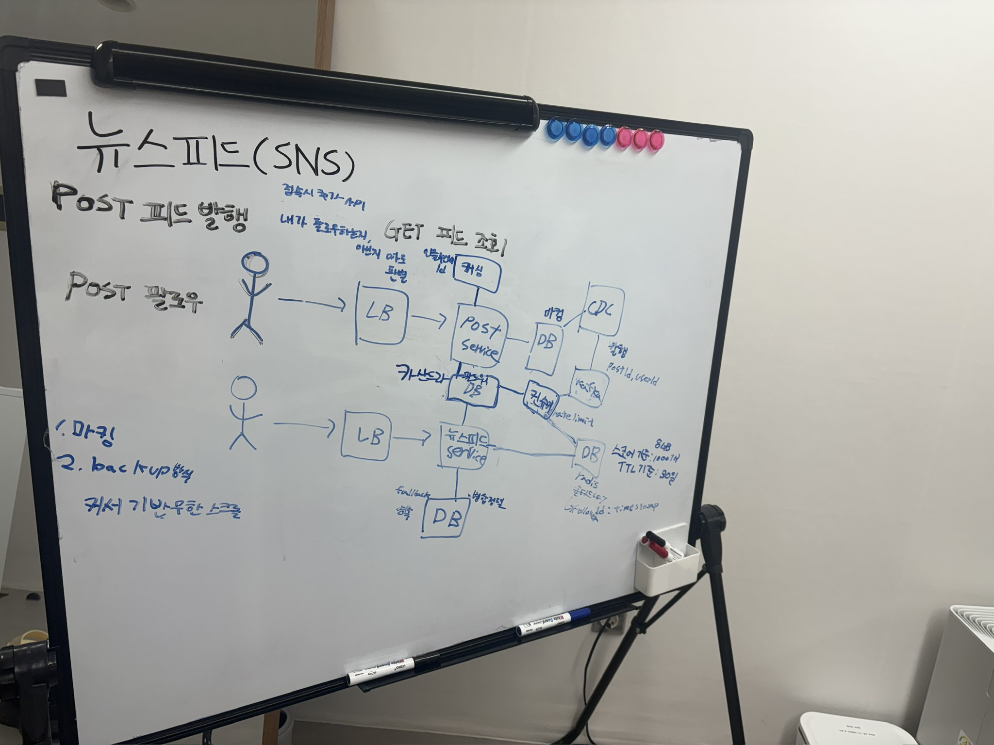 Pull Model을 먼저 검토했는데, 조회 시점에 SELECT * FROM posts WHERE user_id IN (friends...)처럼 데이터를 가져오는 방식이었습니다. 하지만 이 방식은 몇 가지 문제가 있었습니다: