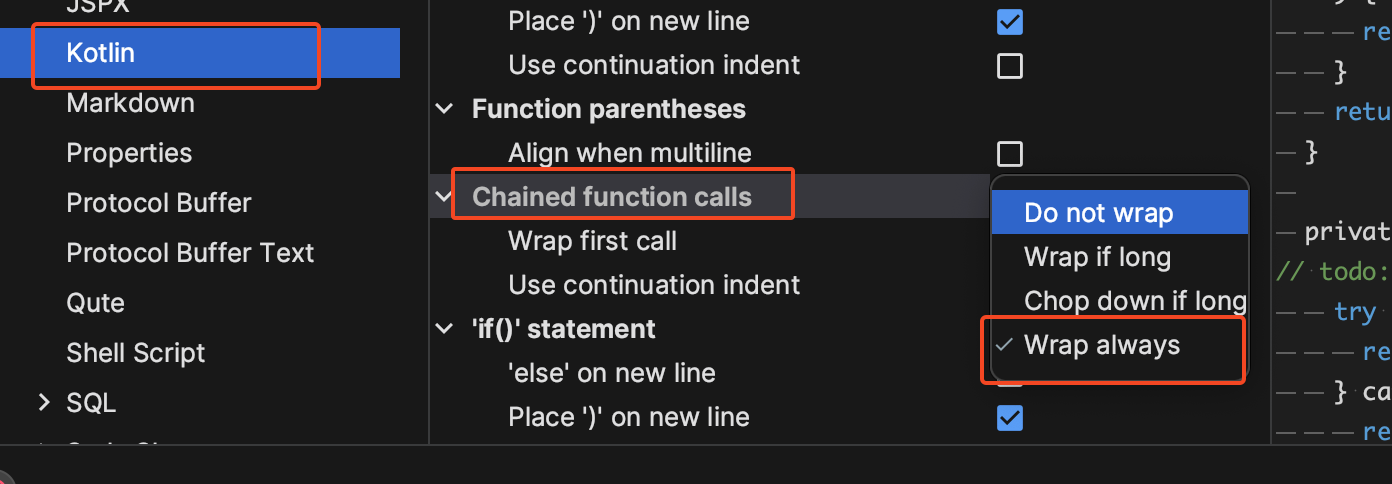 Editor > Code Style > Kotlin > Wrapping and Braces