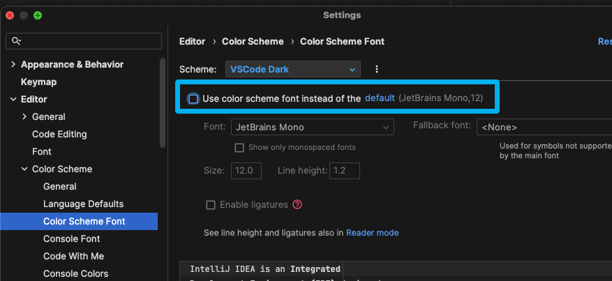 Editor > Code Scheme > Color Scheme Font > Use color scheme font instead of the default 체크 해제하면 해결됨 (왠지는 모름)